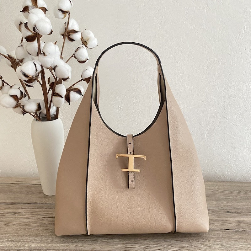バーティカル リブ、ロゴ入りの T タイムレス メタル ペンダントが特徴の、きめ細やかなグレイン レザーのホーボー バッグ。内部の広いコンパートメントに取り出し可能なポーチを備え、日々の装いにトッズらしい品格を添えるスタイルです。
